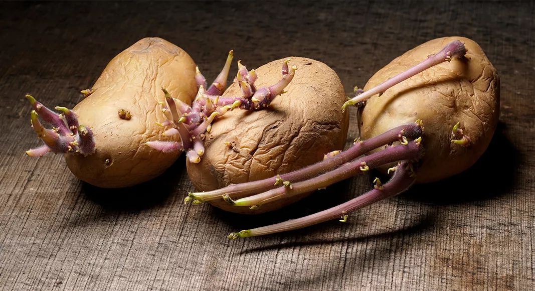 Además, la luz también estimula la aparición de brotes en la patata, otro de los síntomas que indican una presencia elevada de solanina. Si los brotes no son muy grandes es posible retirar las zonas de estos brotes con algunos centímetros de margen y comer el resto. Por ello, para evitar que germinen es recomendable que almacenemos las patatas en un lugar oscuro y alejado de la luz solar, para ralentizar la aparición de brotes en la patata y evitar que se vuelvan verdes de forma prematura.
